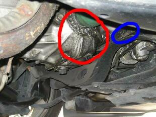 この写真ではドライブシャフトインナーからグリスが漏れています(青丸)。ブーツが破れているのではなく、ブーツを止めているところから熱でトロトロになったグリスが流れてきたのです。ホースバンドの締め付けあるいはブーツのヘタリのために交換が必要です。 |